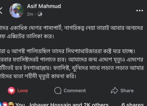 আসিফ আরও বলেন, ‘যারা ৫ আগস্ট পালিয়েছিল, তাদের সিমপ্যাথাইজাররা কষ্টে মরে যাচ্ছে। বারবার ফ্যাসিস্টদেরই পালাতে হবে। আমাদের জন্ম এদেশে মৃত্যুও এদেশের মাটিতেই হবে ইনশাআল্লাহ। ফ্যাসিস্ট, খুনিদের সাথে লড়তে লড়তে আমার ভাইদের মতো শহীদী মৃত্যুই কামনা করি।’