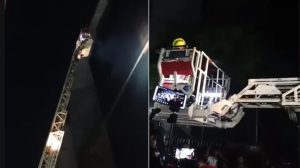 ডেইলি স্টার পত্রিকার অফিসের ছাদে আটকেপড়াদের ক্রেনে নামিয়ে আনা হয়। রাত ২টার দৃশ্য।
